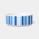 Pet bowl shown in white with a accent print in a blue stripes design.