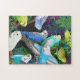 Original fine art painting of colorful budgerigar parrots by artist Carolyn McFann of Two Purring Cats Studio printed on a quality jigsaw puzzle for parrot lovers.