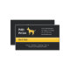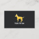 A black business card template for pet care and pet sitting services. It is also suitable for veterinarians or pet clinics. The template design shows the company name and a dog silhouette on the upper left side. To the right of the company name and dog silhouette you can find all contact details. Services and a Slogan are placed on the bottom of the business card.