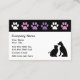 Trendy Pet care business cards with stylish colorful paw prints graphic along with a dog and a cat logo. An editable template you can customize online with color coordinated flip side background color. Perfect for anyone that does pet grooming, has a pet salon, or a professional pet groomer, pet sitter, or even a veterinarian.