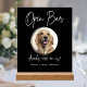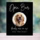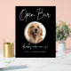 Cute editable pet wedding signature drink sign features a circle frame to feature your pet's picture along with calligraphy font Open Bar, drinks are on us! Personalize with the bride and groom's names and pet name.