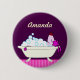 Cute dog is soaking in a bubble bath on this pet groomer's name pin. Pink striped floor and dark background. Great for dog groomers - add your name.