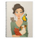 Charming illustrated woman with brown hair, surrounded by her adorable pets — two cats, a puppy, and a vibrant parrot, all sharing a heartwarming moment.
