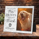 Pet dog memorial plaque featuring a framed treasured photo of your beloved dog, a modern white marble background, a paw print with a heart, a sympathy remembrance quote that reads "you left your paw prints forever on my heart", plus their name, and dates.