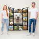 A dog really is a man's (or woman's) best friend! A personalized dog memorial blanket featuring a trendy black background, a 15 picture collage of your dog, character words that represent your animal, the saying "best dog ever", and their name.