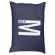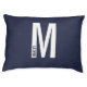 This modern pet bed features personalized monogram letter "M" and name in modern bold sans serif font style.