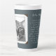 Tall latte mug with animal photo template (cat, dog, or any pet) and paragraph to tell about the special characteristics of the animal. Dark gray-blue color with an old-fashioned photo album frame around a square photo template. The text beside the photo has a place at top for the pet's name, with a paragraph beneath to include lots of fun information about the special family member. Text is a hand-printed font style in white and can hold info about how the pet was found or adopted, his or her unique abilities and traits, likes and dislikes, quirky behavior, etc.. This tall mug makes a sweet gift to any animal lover, and could be created in memory of a pet who has passed on.