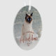 Commemorate your pet's first Christmas in their new home with this beautiful modern keepsake ornament. The text reads "First Christmas in my fur-ever home," with the words "fur-ever home" in elegant rose gold faux foil script. Replace the sample image with a photo of your cat or dog and add their name and the year in dark rose sans serif font. A white gradient filter helps make the text pop.