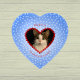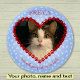 Add a photo, a name, a caption for this unique personalized paperweight. The photo of your pet has a heart frame made of pawprints in deep red, matching the name and the caption. The background is a light blue with a scattering of pale hearts.