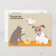 Cute postcard for pet sitting business. Cat is feeding a goldfish and a dog sits nearby. A cockatoo is on a swing above.