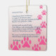 Memorialize your pet's memory with this square ornament. Hang in a place where they can be remembered. The comforting words of this poem should help anyone who is grieving the loss of an animal. Animals are such a part of our lives that it is a difficult moment when they pass. The prose here allows us to picture them in a perfected form and understand that they are always with us. This design is pink for a female animal.