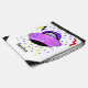 Pretty pink purple spaceship. Petals the Spaceship cartoon character is happy with a smiling face on the right side with blue eyes and eyelashes, cute nose, and colorful flowers with look of 3D flower accents. Bottom of ship is black with blue dots, yellow laser light beams underneath soaring into the galaxy of stars and lightning bolts. Original Artwork © TamiraZDesigns.