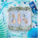 This design features Peter Rabbit Storybook Characters on a blue watercolor sky and eucalyptus greenery leaves. Perfect for baby shower or a birthday party.