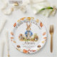 Peter rabbit fall themed baby shower tableware template personalized plates, a cute bunny in a blue jacket with mushrooms and fall leaves, nice for autumn time functions.