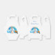 This design is a colorful watercolor painted rainbow and clouds with Peter Rabbit pushing a wheelbarrow with carrots. Matching invitations and party supplies are available in this collection suite.