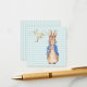 Peter the Rabbit with a pastel square pattern background.