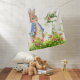 Peter the Rabbit in his little flower garden checking the cute bird house.