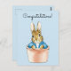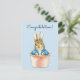 Peter the rabbit in his blue jacket sitting in a terracotta pot.