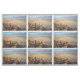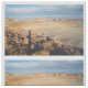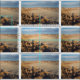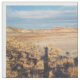 Stylish fabric features a repeated photograph of Petrified Forest National Park near Holbrook, Arizona. Desert grasses angle across the lower left of the photo. Sand spans the next wedge to the distant striated hills on the horizon. A cloudy sky tops the image. A waving shadow self-portrait rises from the bottom of the frame.