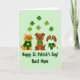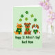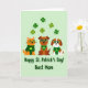 This card features three friendly, human-like pets lined up side by side: an orange cat, a brown dog, and a brown-and-white puppy, all facing forward with a cozy, close-together feel 💚. Each one wears green clothing and round glasses, giving them a sweet, attentive look, like they’re sharing a quiet inside joke with you. The cat has a deep green sweater with a shamrock on the chest, while the brown dog wears a patterned green bandana with a little clover detail. The puppy stands at the other end in a green striped jumper marked with a three-leaf clover, leaning in to match the group’s togetherness ☘️. Behind them, a pale green background sets a soft scene, with shamrocks sprinkled above in several emerald tones. The message “Happy St. Patrick’s Day! Best Mom,” sits below the characters in dark green lettering, centered beneath the lineup. Small shamrocks drift across the upper half of the card, creating a gentle arc over their heads.
