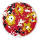 A vibrant red, yellow, black and white pop art design of petunias.