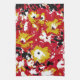 A vibrant red, yellow, black and white pop art design of petunias.