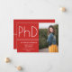 An announcement for a PhD graduate. This minimalist design is red and white. The photo is a template that is meant to be swapped out for your own. All the words and both colors can be customized.
