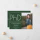 An announcement for a PhD graduate. This minimalist design is green and white. The photo is a template that is meant to be swapped out for your own. All the words and both colors can be customized.