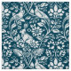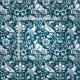 Fabric in a William Morris, Art Nouveau wallpaper design of pheasants and hares set among leaves, vines and flowers - subtly textured white on an indigo / denim blue background