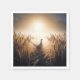 A pheasant stands in the middle of a wheat field with the sun rising in the background casting a golden light and creating an ethereal misty atmosphere.