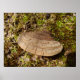 Phellinus igniarius mushroom, growing on a moss covered fallen oak tree, showing cracked cap