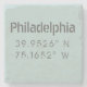 Modern industrial style font, grey on pale blue background with the longitude and latitude coordinates for the city of Philadelphia, PA