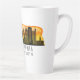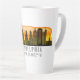 Stylish latte mug features Philadelphia Pennsylvania city skyline silhouette with sunset watercolor splash background and latitude & longitude map coordinates.