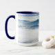 Christian inspirational quote scripture coffee mug depicts a nature photograph with blue mountains coved with a foggy cloud. It features Bible Verse Philippians 4:13, "I can do all things through Christ who strengthens me."