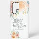 This inspirational Samsung case is adorned with soft peach watercolor flowers and pastel greens. We have added scripture from Philippians 4:13 "I can do all things through him who strengthens me."