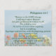 Philippians 4:4-7 Christian Bible Verse Memory or meditation Card. Beautiful flowers set off this scripture in Philippians 4:4-7 , which read "Rejoice in the Lord always. I will say it again: Rejoice! Let your gentleness be evident to all. The LORD is near. Do not be anxious about anything, but in everything, by prayer and petition, with thanksgiving, present your requests to God. And the peace of God, which transcends all understanding, will guard your hearts and your minds in Christ Jesus." These are perfect tools to help you learn to meditate on or memorize bible verses. The pretty picture is on both the front and the back. One side has the whole verse and the other has only the scripture address.