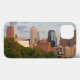 This is the beautiful skyline of the city of Philadelphia, taken from a bridge crossing the Schuylkill River. The architecture of the skyscrapers and buildings of Philly are on display in this photo. Center City, the downtown area of Philadelphia, is the focus of this photograph. Pretty clouds hang overhead in the summer sky.