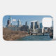 This is the beautiful skyline of the city of Philadelphia, taken from a bridge crossing the Schuylkill River. The architecture of the skyscrapers and buildings of Philly are on display in this photo. Center City, the downtown area of Philadelphia, is the focus of this photograph. Puffy clouds hang overhead in the winter sky.