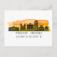 Postcard design features Phoenix, Arizona city skyline silhouette with sunset watercolor splash background and latitude & longitude map coordinates.