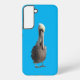 Pelican in sunlight. Light reflects off of white head feathers and long bill. Shy bird has his head tilted down so tip of bill is touching brown breast feathers. Aqua blue background.
