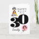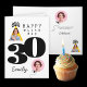A fun custom photo 30th birthday card with a customized name. Bold typography of the age in black and white. Personalize the balloon and party hat with 2 custom photos.