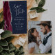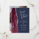 This elegant modern save the date card features a burgundy watercolor agate geode border trimmed with faux silver glitter. The silver gray text appears on a navy blue background. Easily replace the sample image on the reverse side with a vertical photo of the future bride and groom.