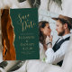 This elegant modern save the date card features a burnt orange watercolor agate geode border trimmed with faux gold glitter. The gold-colored text appears on a dark green background. Easily replace the sample image on the reverse side with your favorite vertical photo.