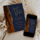 This elegant modern save the date card features a burnt orange watercolor agate geode border trimmed with faux gold glitter. The gold-colored text appears on a navy blue background. Easily replace the sample image on the reverse side with your favorite vertical photo.