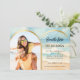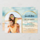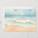 On front: Add your own vertical size photo. Faux gold photo arch frame. Watercolored sandy beach with waves as backbround. Personalize and add your names and the date.