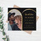 On front: Add your own vertical size photo. A faux gold photo arch frame. A classic black background, golden text. Personalize and add your nams and the date.