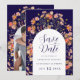 Announce your special day in style with this Wildflower Photo Arch Fall navy blue and white Wedding Save the Date. Blending autumnal charm with elegant sophistication, this design features hand-painted watercolor wildflowers arranged around a graceful arch. The rich, seasonal palette—burnt orange, terracotta, brown, orange, purple, yellow, coral, burnt umber, peach, and soft pink—captures the warmth and natural beauty of fall.