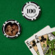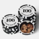 These custom poker chips feature a bold number on the front, which can be personalized with any number up to four digits. That way you can have from $5-$1000 or more! The front has a clean white background with crisp black fonts for a classic, striking look. The back includes space for a photo, making them perfect for weddings, mancaves, bachelor parties, or as a memorable gift. All text, numbers, and details can be fully customized to fit your style or event theme.