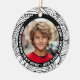 A single photo with a whimsical abstract black and white border. Add custom text around the photo in a retro, funky type. The ornament is single sided.