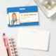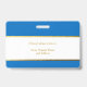 An elegant badge intended for a doctor or nurse (but can be also used for other employees). On both sides it has blue background and a white stripe with faux gold foil borders and golden texts inside. On the front it also has a photo in a faux gold foil frame, on the left, over the white stripe and the name - the first line of text - is written in bigger golden letters.